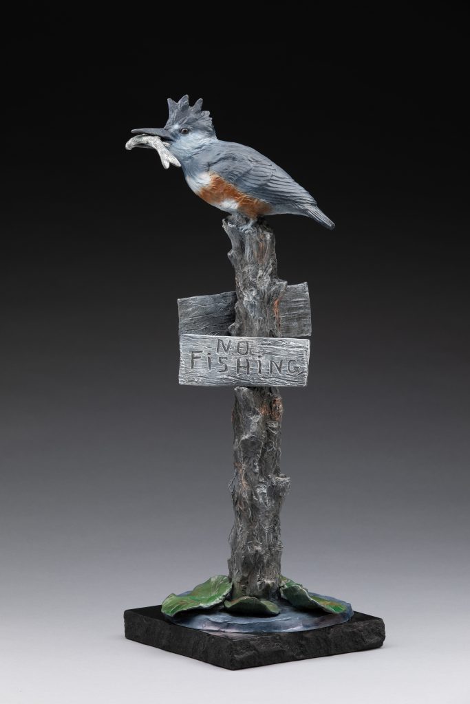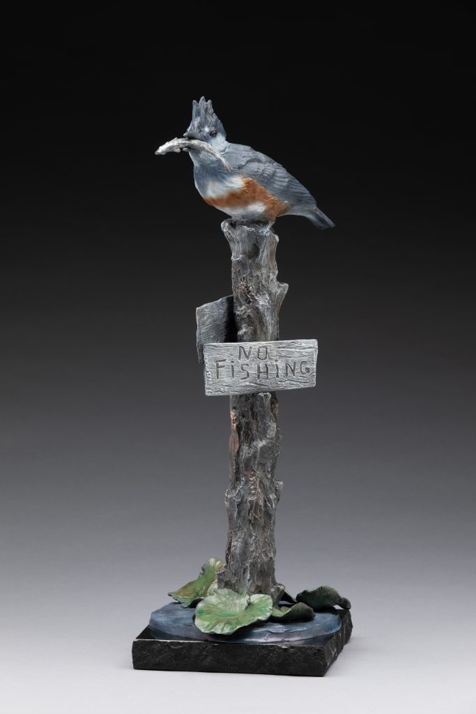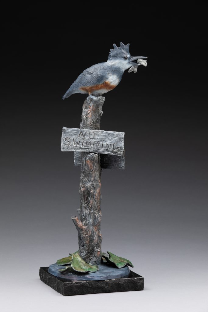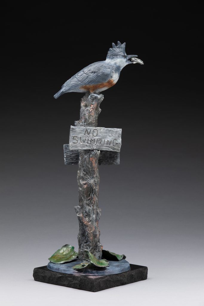“Birds Don’t Read” was inspired by memories from the Chain-of-Lake’s region in northern IL where I grew up. We could run down the hill in front of our home, get into our 14-foot runabout boat, and go through various lakes or down the Fox River. One of my favorite lakes was known as ‘Mud Lake’. It was very shallow and filled with cattails, lily pads, and all sorts of wonderful creatures in great abundance: turtles, frogs, water snakes, many species of dragonflies, damsel flies, and birds. There was a narrow channel through Mud Lake that was marked as a ‘no-wake’ zone, with the signs displayed on old, weathered posts stuck in the mud. It wasn’t an area that anyone would want to swim but it was SO much fun to putter slowly through that little lake watching the turtles and frogs popping up to the surface and then disappearing as we got closer, all while the birds and dragonflies zipped around us. This is my tribute to a time of innocence and delight in the natural world that I was so privileged to be able to experience when I was young.